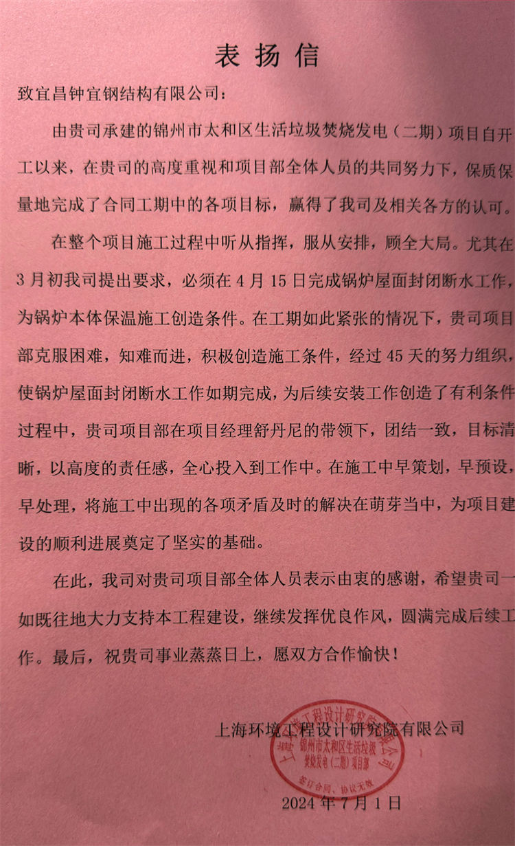 近日,公司收到了一封來自上海環(huán)境工程設(shè)計研究院有限公司的表揚信,信中,上海環(huán)境工程設(shè)計研究院及各方對錦州項目部保質(zhì)保量地完成了合同工期中的各項目標表示祝賀,并對我司履職盡責的工作態(tài)度深表贊揚。