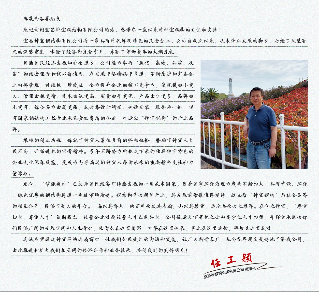 鐘宜鋼結(jié)構(gòu)秉承“誠(chéng)信、高效、品質(zhì)、雙贏”的經(jīng)營(yíng)理念,打造精品工程,誠(chéng)交天下朋友,攜手共創(chuàng)輝煌,以不懈努力勇攀鋼結(jié)構(gòu)行業(yè)的高峰。