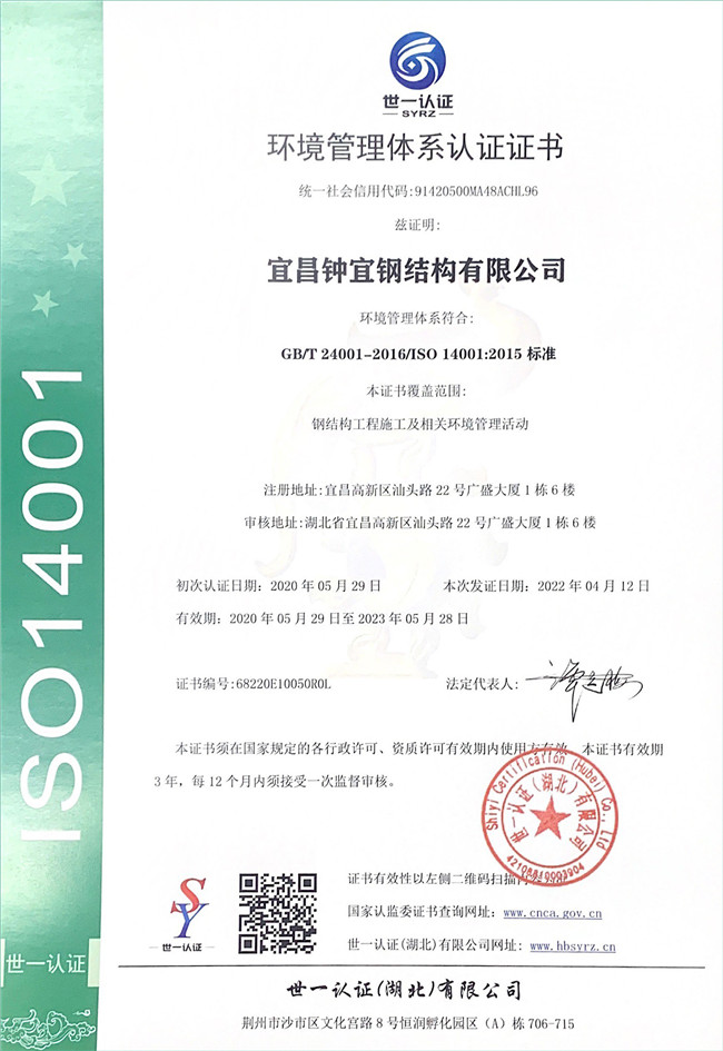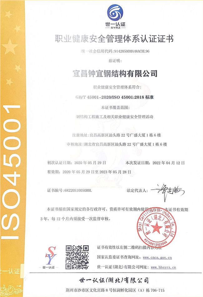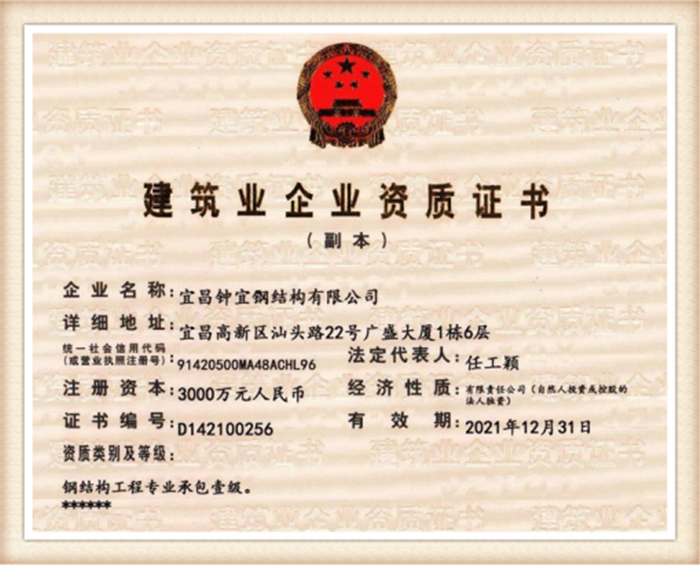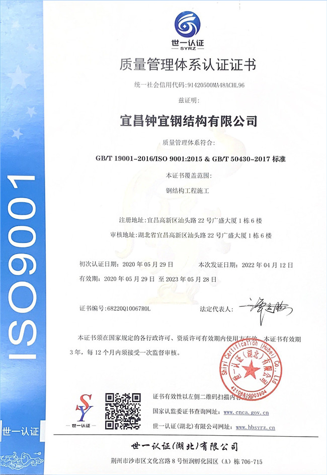 公司擁有國(guó)家鋼結(jié)構(gòu)工程專業(yè)承包壹級(jí)資質(zhì),并通過(guò)了ISO9001-質(zhì)量管理體系、ISO4001-環(huán)境管理體系、GB/T28001-職業(yè)健康安全管理體系的三大體系認(rèn)證。具有承接各類重鋼結(jié)構(gòu)、輕鋼結(jié)構(gòu)、網(wǎng)架鋼結(jié)構(gòu)、索模鋼結(jié)構(gòu)、水工鋼結(jié)構(gòu)以及特殊鋼結(jié)構(gòu)工程的能力。